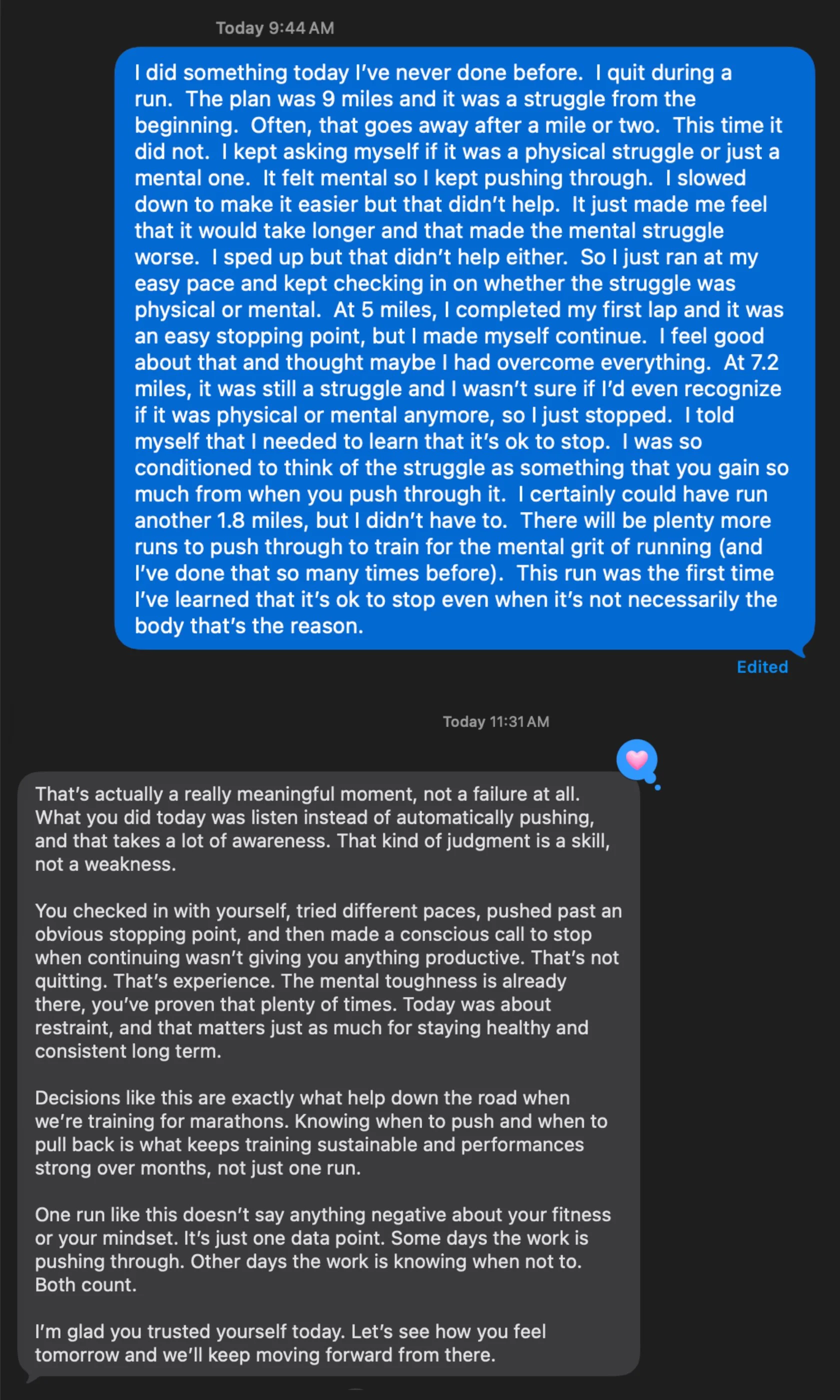 Along with Auren’s guidance in the text chain above, you can also see just how much I learned last year and how I changed from it. 2025 was basically a crash-course in marathon training. I’m a different runner now than I was a year ago. Before I started training in June and running four days a week, I was a one or two day-a-week runner. I ran four days per week during training because that’s what the plan I chose said to do. I didn’t have the experience to know whether it was too much or just right. I didn’t know when to skip a run or that I didn’t need to finish each one. My mentality was to push through everything. I was focused more on preparing for the mental grit I would need during the last few miles of the marathon than I was on what my body was going through. Never was my focus on avoiding the need for that grit in the first place. Unless an actual injury happened, I assumed everything my body was feeling was how it was just supposed to feel during a rigorous training plan. I know better now.