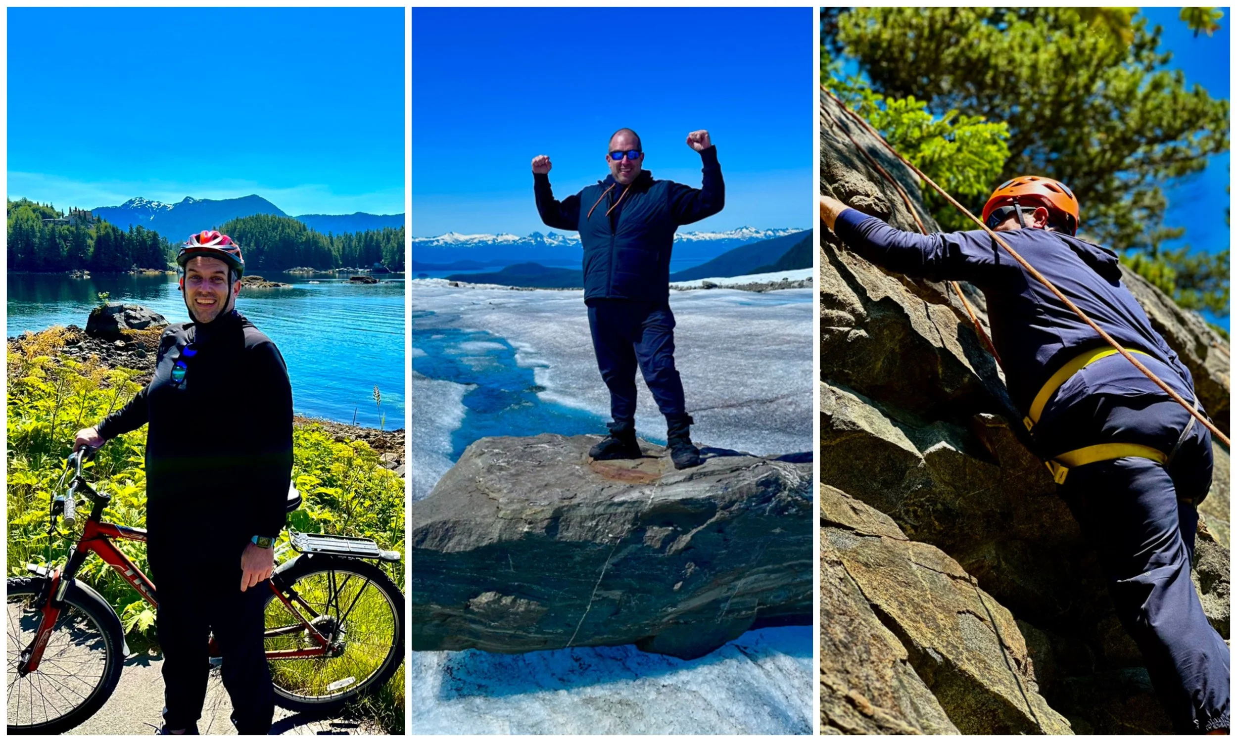 July 4th vacations to Abbey Road, London with my dad (top left), Alaska with my parents (bottom left), and Italy seeing Pearl Jam with friends (right).