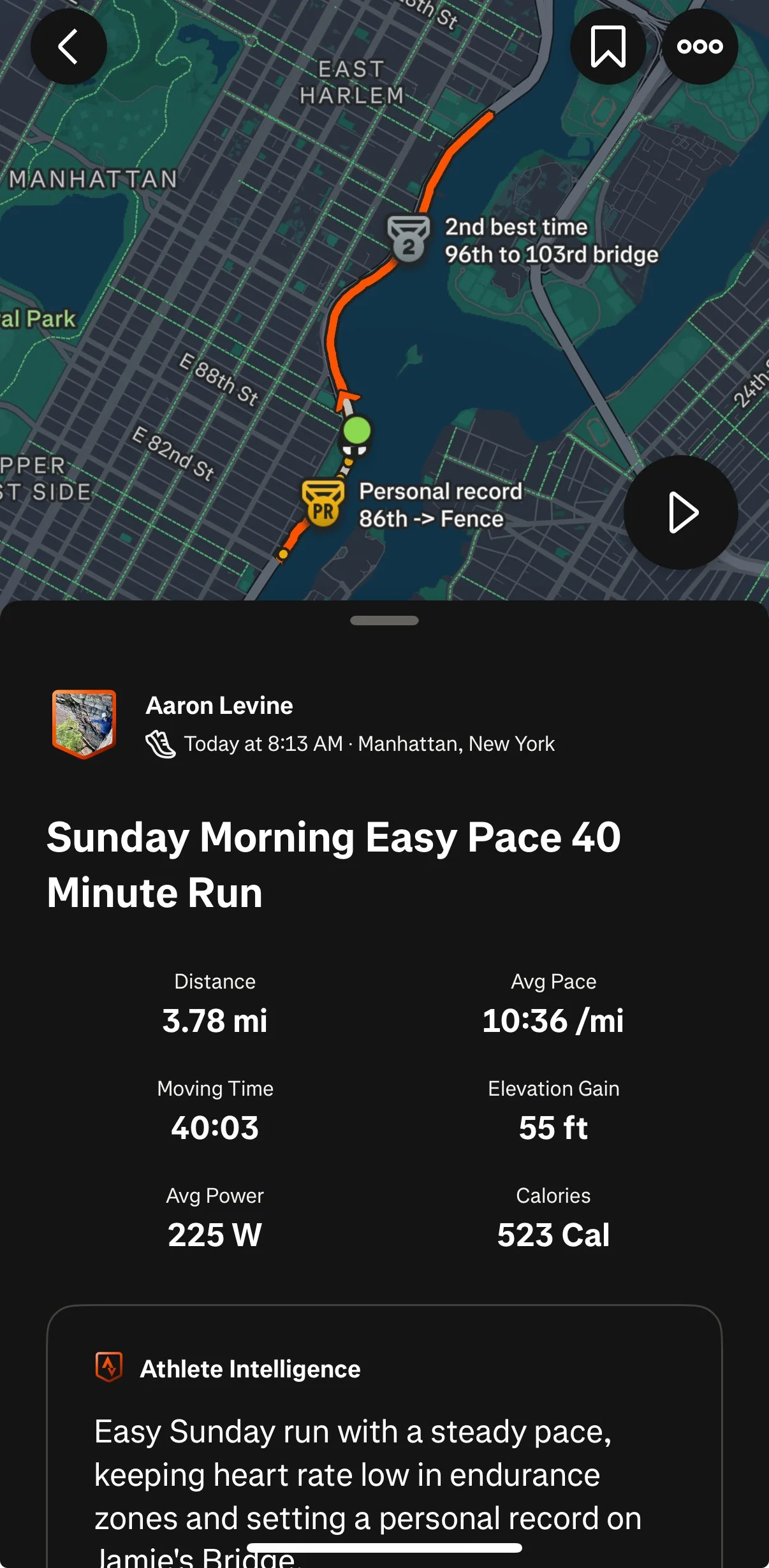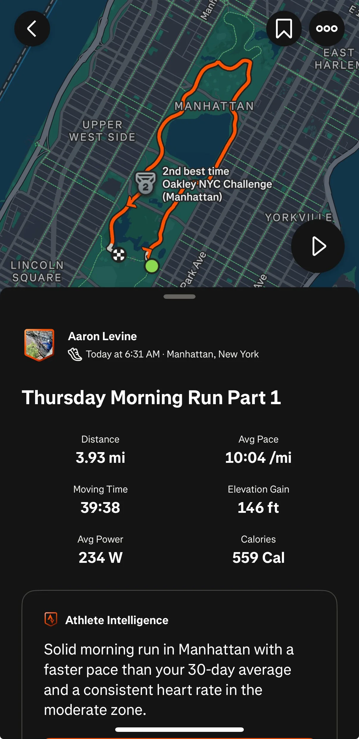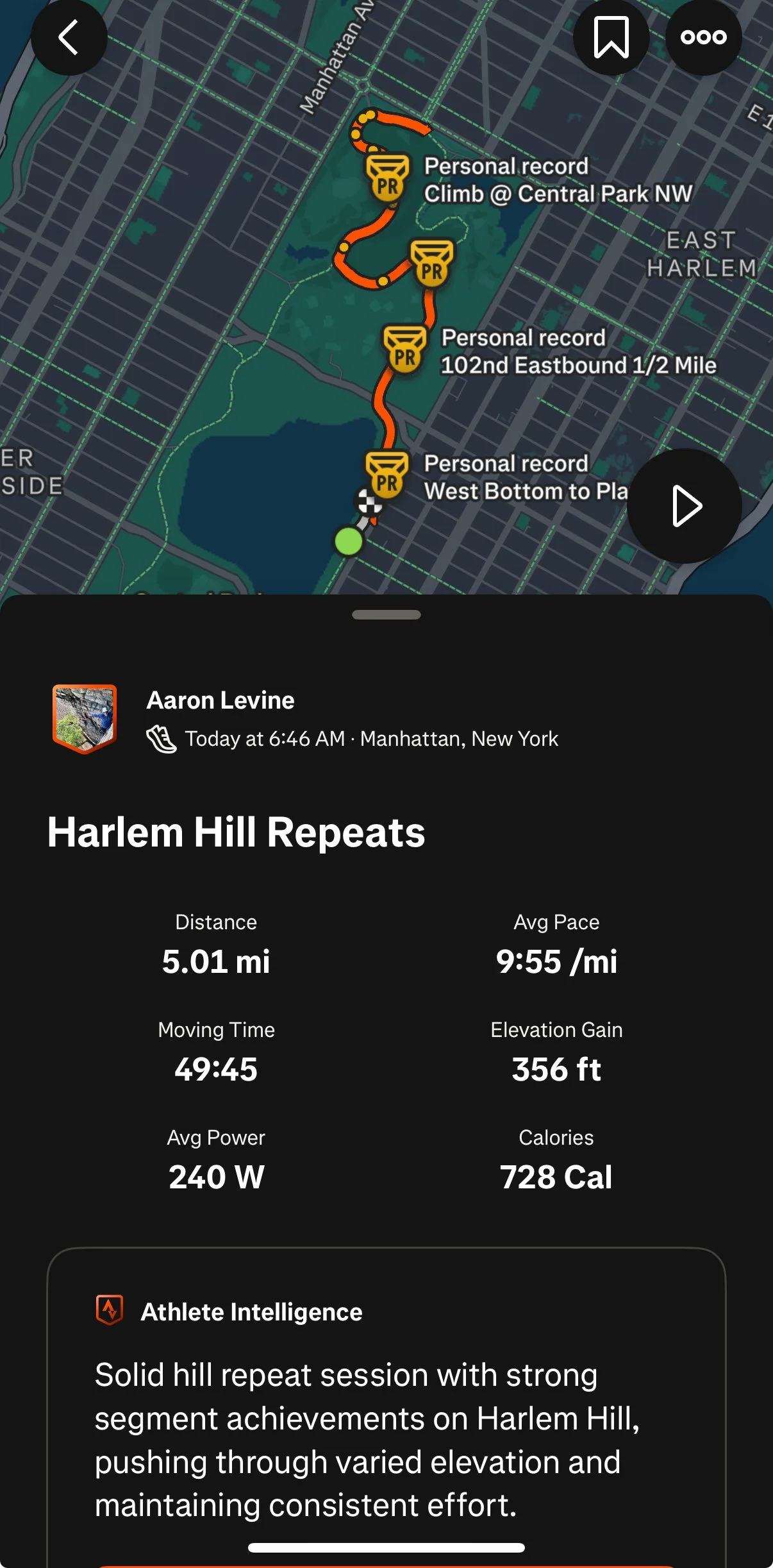 *5.0-mile run (49:45): I took on the dreaded Harlem Hill in Central Park for this one and pushed myself each time I repeated the uphill portion. According to my Strava app, I set PR segments each time I ran the hill. Finishing this run at under 10 minutes per mile was a sign of real progress given the steep hills.