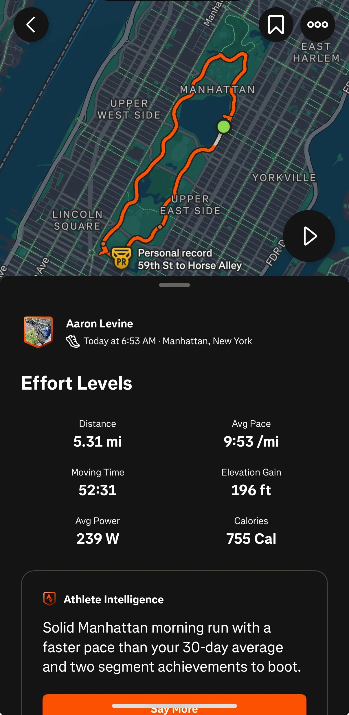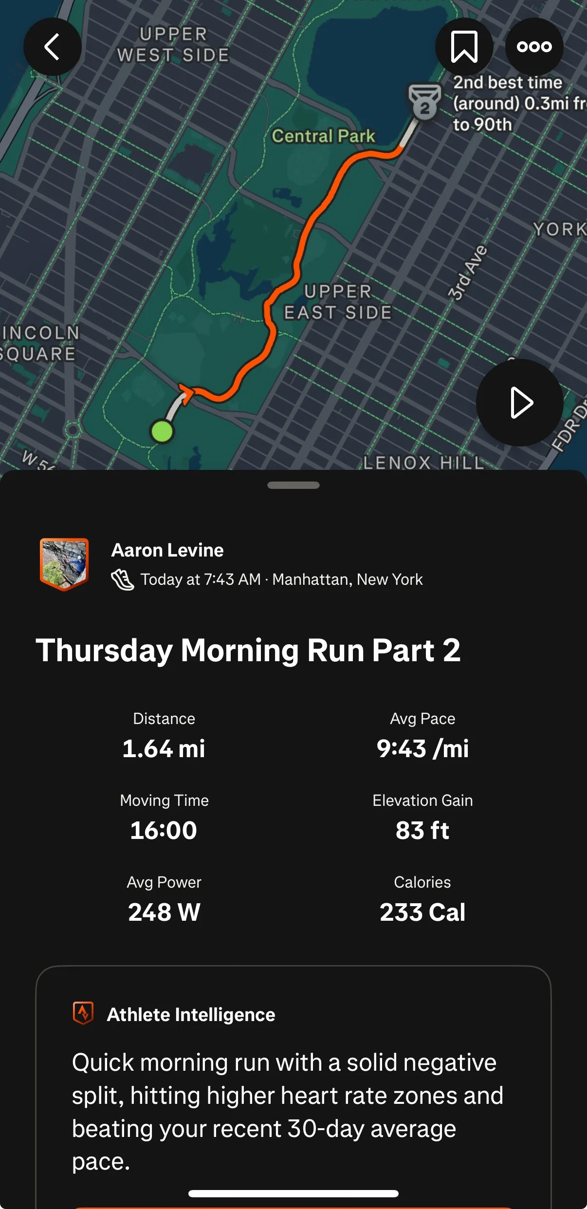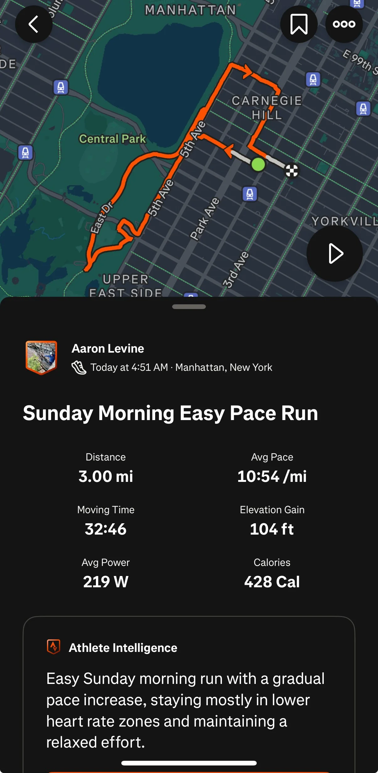 *5.0-mile run (49:45): I took on the dreaded Harlem Hill in Central Park for this one and pushed myself each time I repeated the uphill portion. According to my Strava app, I set PR segments each time I ran the hill. Finishing this run at under 10 minutes per mile was a sign of real progress given the steep hills.